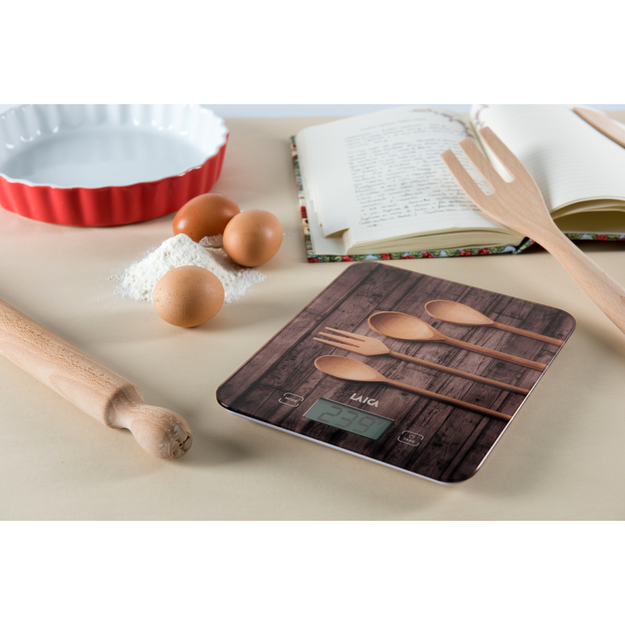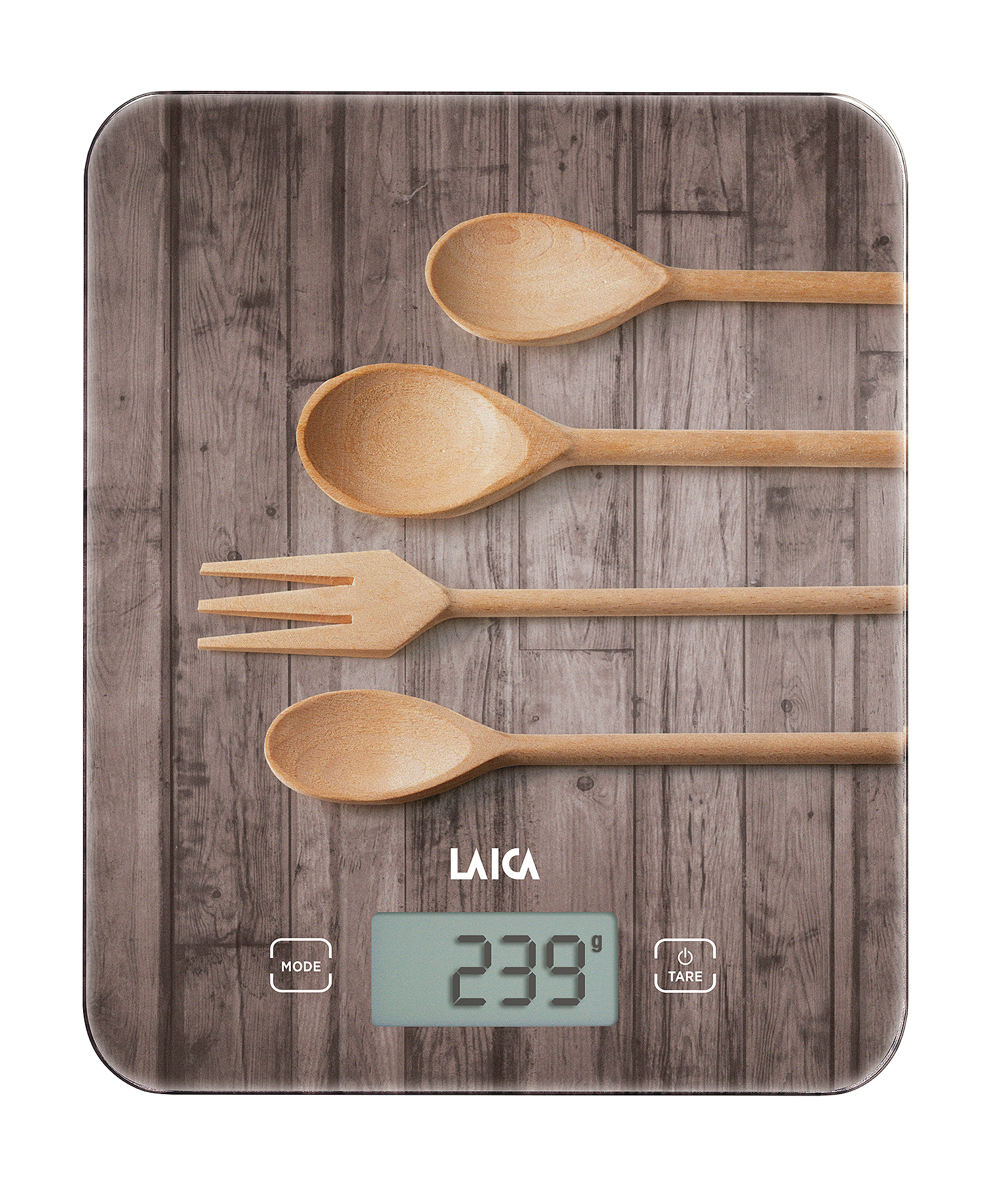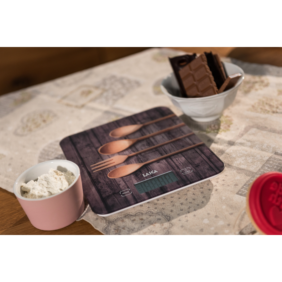 Laica digitális konyhai mérleg, mutatós konyha dizájnnal.