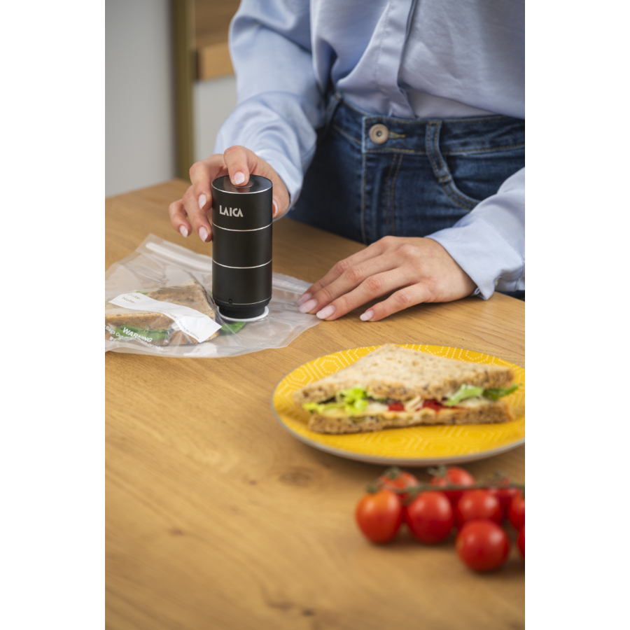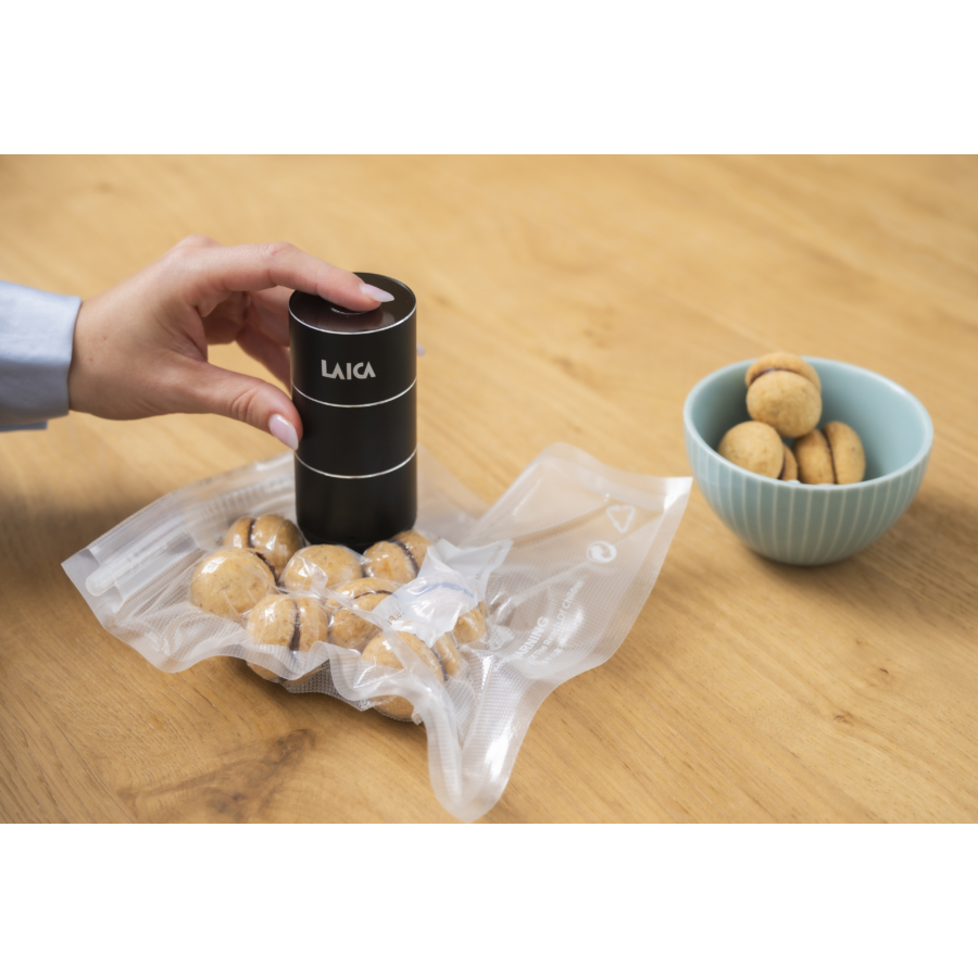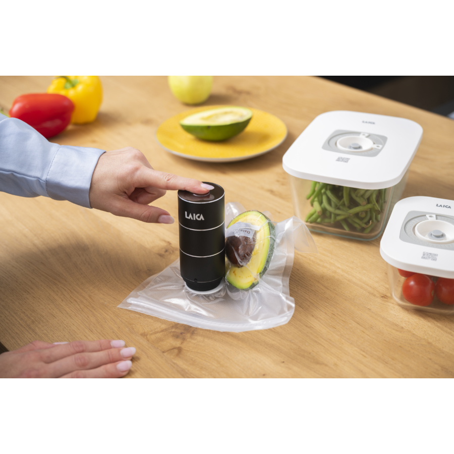 A LAICA újratölthető mini vákuumpumpa egyszerű és hatékony megoldás, hogy az ételeidet tovább frissen tartsd. Kompakt, elegáns kialakításának köszönhetően könnyen tárolható, és egyszerűen használható egyetlen gombnyomással. A készülék USB-n keresztül tölthető, egy feltöltéssel akár 70 percig működik, ami körülbelül 280 vákuumzárásra elegendő. A csomag tartalmaz 10 újrahasználható, BPA-mentes vákuumtasakot, amelyek biztonságosan megőrzik az ételek minőségét és ízét. Kompatibilis LAICA vákuum üveg edényekkel is.