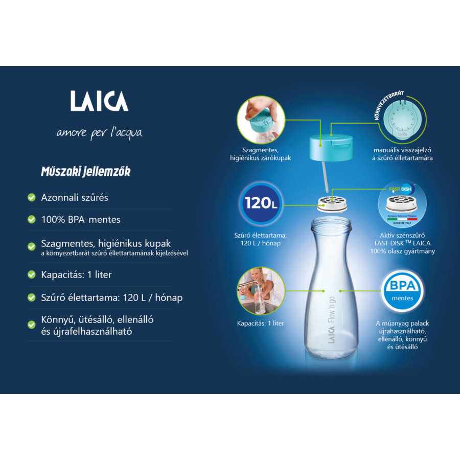 A FAST DISK aktívszén szűrő javítja a víz ízét, jelentősen csökkenti a vízben lévő klór mennyiségét, miközben megtartja a szervezeted számára hasznos ásványi anyagokat. A myLAICA vízszűrő kulacs tökéletes megoldás a gyors, egyszerű és fenntartható hidratáláshoz.